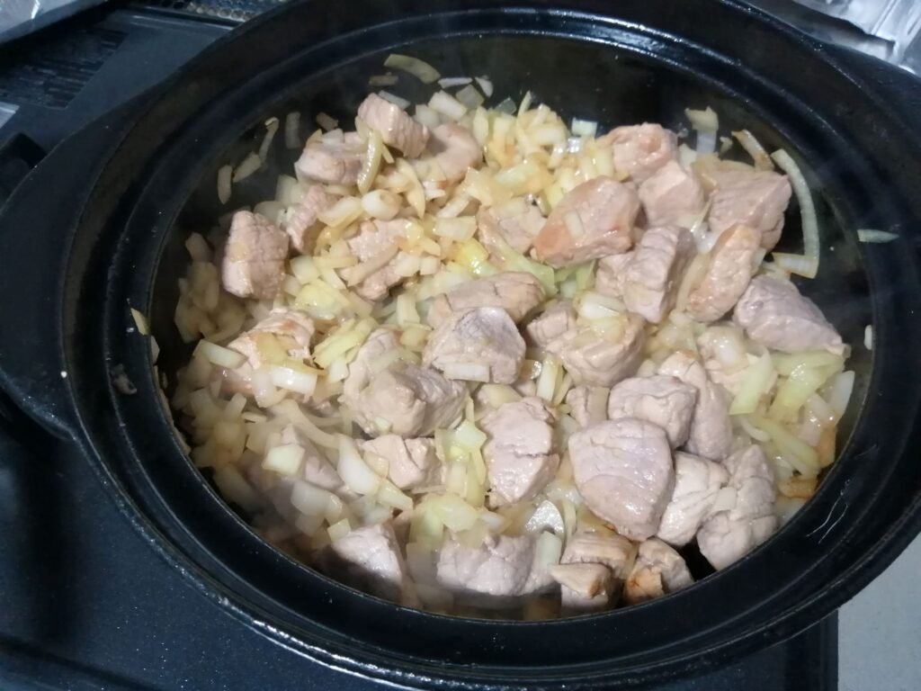 まずは、豚肉、玉ねぎなど材料を切ります。厚手の鍋に油を入れ、肉を焼く。すこし焦げ目がつくまで強火で焼くこと。その後、玉ねぎを加えてしっかり炒めます。お湯を入れ、ふたをしてから30分ほど煮込みます。