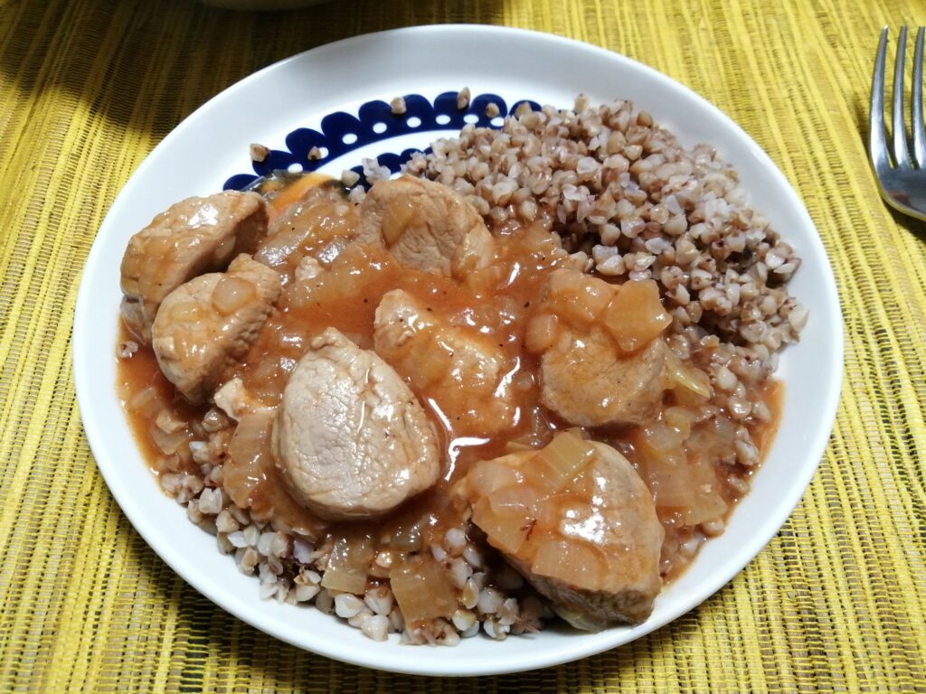 今回は豚フィレ肉を使ったので、ちょっと上品すぎるテイストになってしまいました。うーん、もっと脂身のあるお肉の方がいいかも。上品すぎた…。付け合わせは蕎麦の実。「マカロニや米にしてもいいですね。これも家庭料理ですから、たくさん作って下さい。明日も食べられるようにたくさん作るのが美味しく作るコツです。仕事から帰ってきて、温めればすぐ食べられます」とヴェーラさん。
