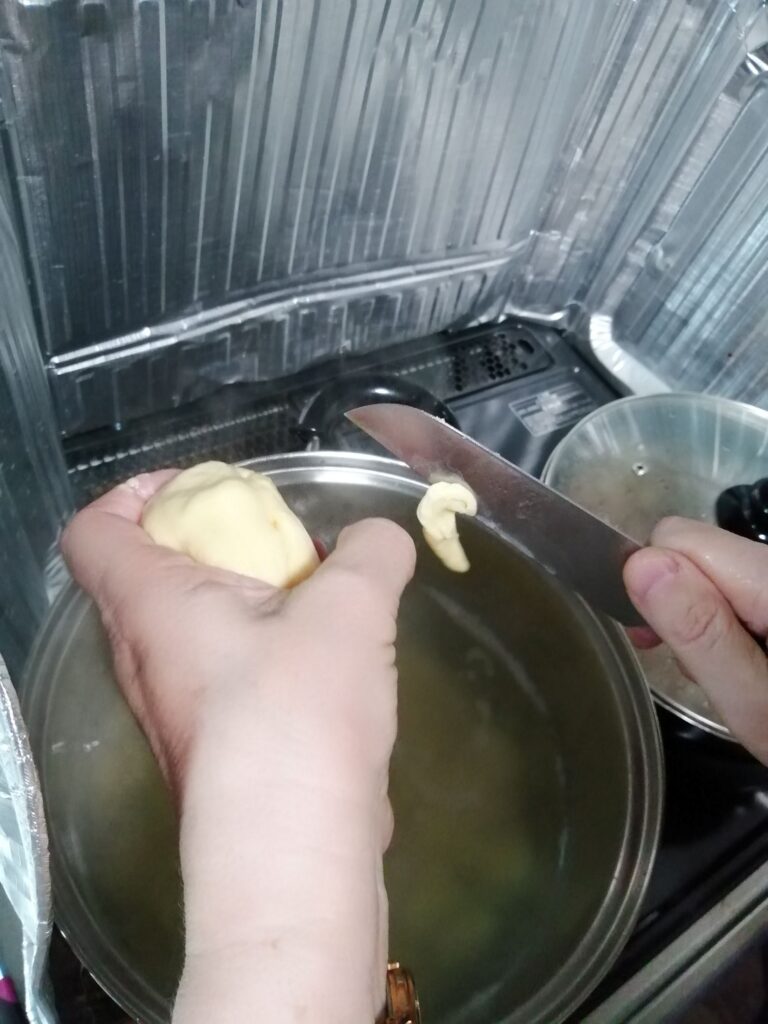 「じゃあさっきの生地を出しましょう」「ハイ」ヴェーラさんはお鍋の上に生地を、片手にはナイフ。まさかここで切るんじゃ…。「鍋の上で生地を小さく切り落としますよ」手慣れた手つきですっと小さなパスタを、じゃが芋の入ったお鍋に落としていきます。え~!無理!掌の中で切るなんて!「じゃあ、まな板で切ってもいいですよ」お願いします。