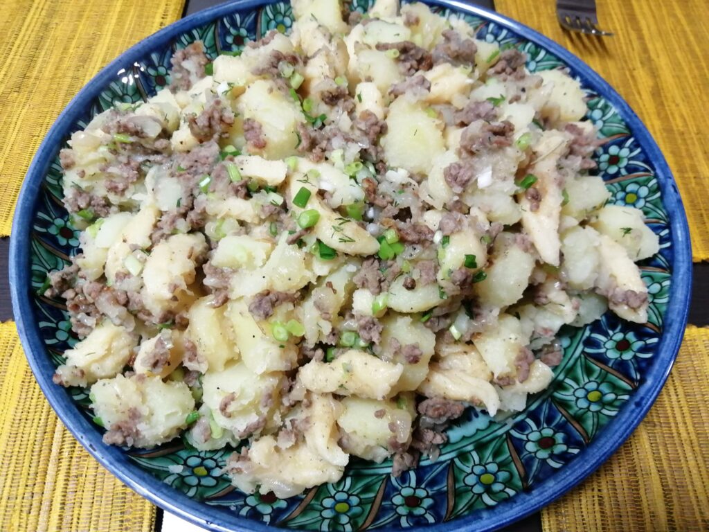 ひき肉と玉ねぎの入ったフライパンに、ゆであがった生地をすくって入れます。じゃが芋が煮えたら、今度はそこにじゃが芋を投入。あさつきとディルを加え、塩味を調整して完成です。