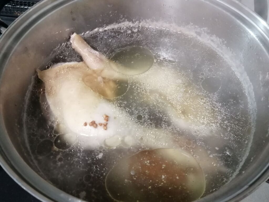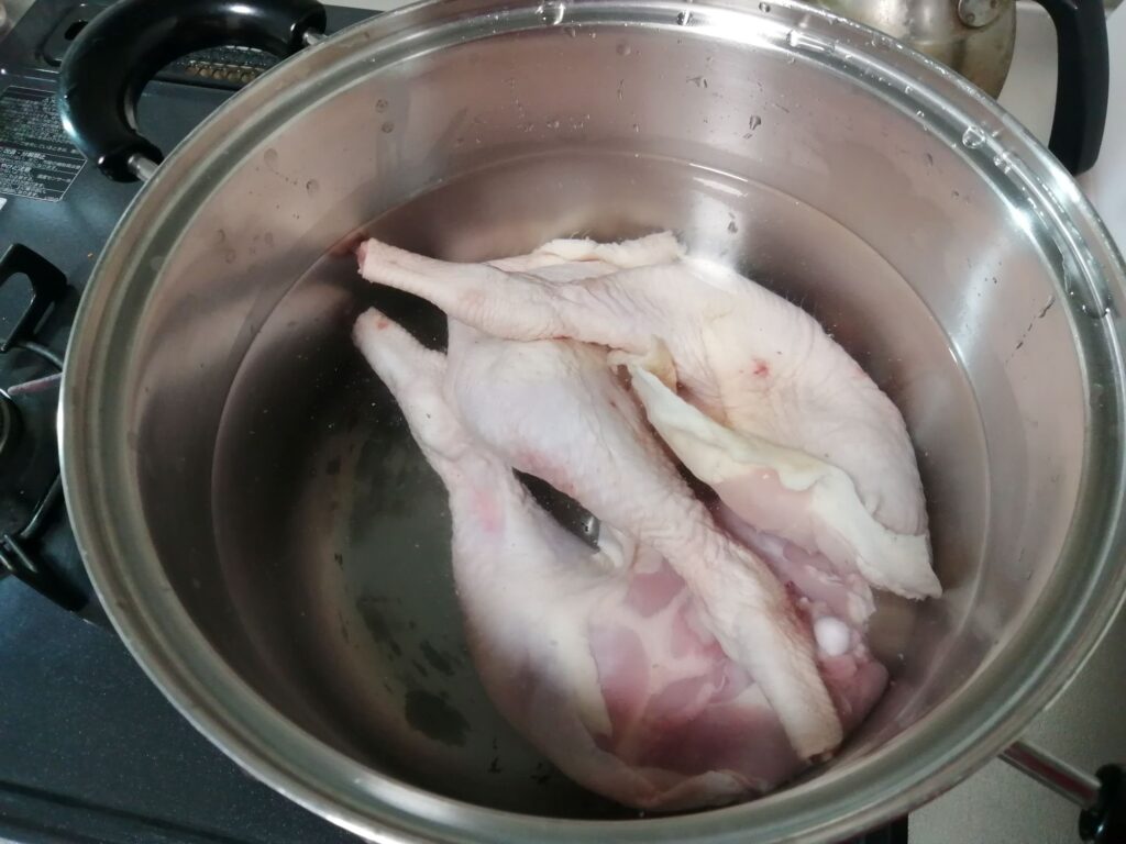 まずはスープ用の鍋に鶏肉をいれ、水を入れて火にかけます。