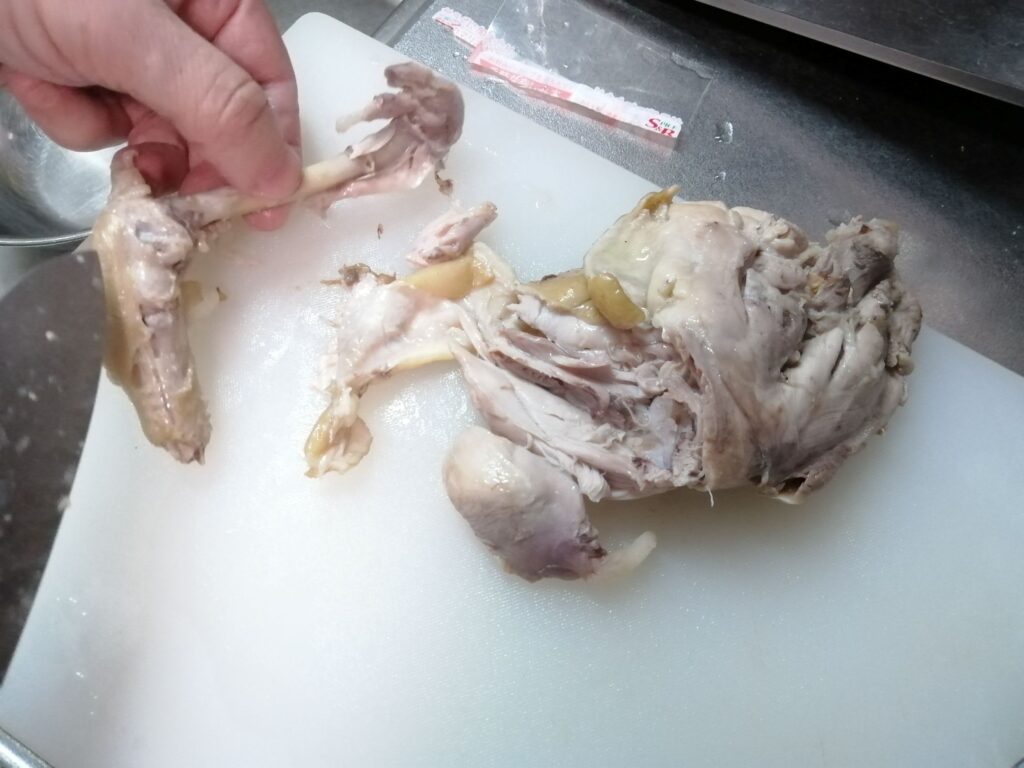 マッシュルームにさっと塩をふり、温めたフライパンに入れて強火で炒めましょう。マッシュルームの水分をしっかり出すのがポイントです。マッシュルームの水分がとび、薄く茶色になったら、油を大さじ5程度入れ、さらに炒める。そこに玉ねぎ、にんじんを加え炒め続けます。続いて、お鍋の鶏肉の具合を確かめます。煮えていればまな板に出し、身から骨を外すのですが…これは結構熱い。「手ではずすんですか~!」「そうですね」ウーン、これは覚悟がいるわね。しかし美味しいものを食べるには、やるしかない。