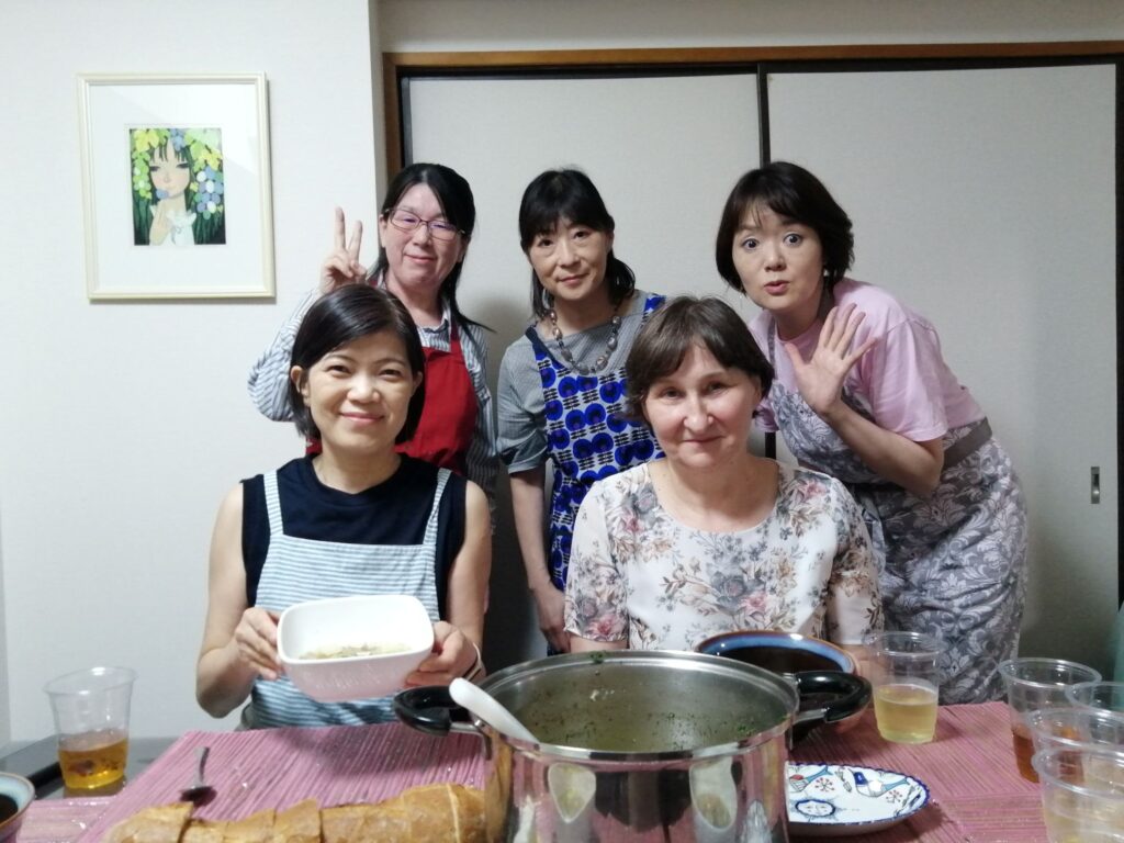 お楽しみの試食。「ん~!コクがあって美味しい」「マッシュルームの香りが良い感じです」参加者の皆様にも(いつもながら)大好評です。「蕎麦の実の代わりに大麦をいれたりもします。穀物を入れることで、スープのボリュームが増してお腹いっぱいになります。ぜひ、このスープには穀物をいれてチャレンジしてください」とヴェーラさんよりアドバイス。