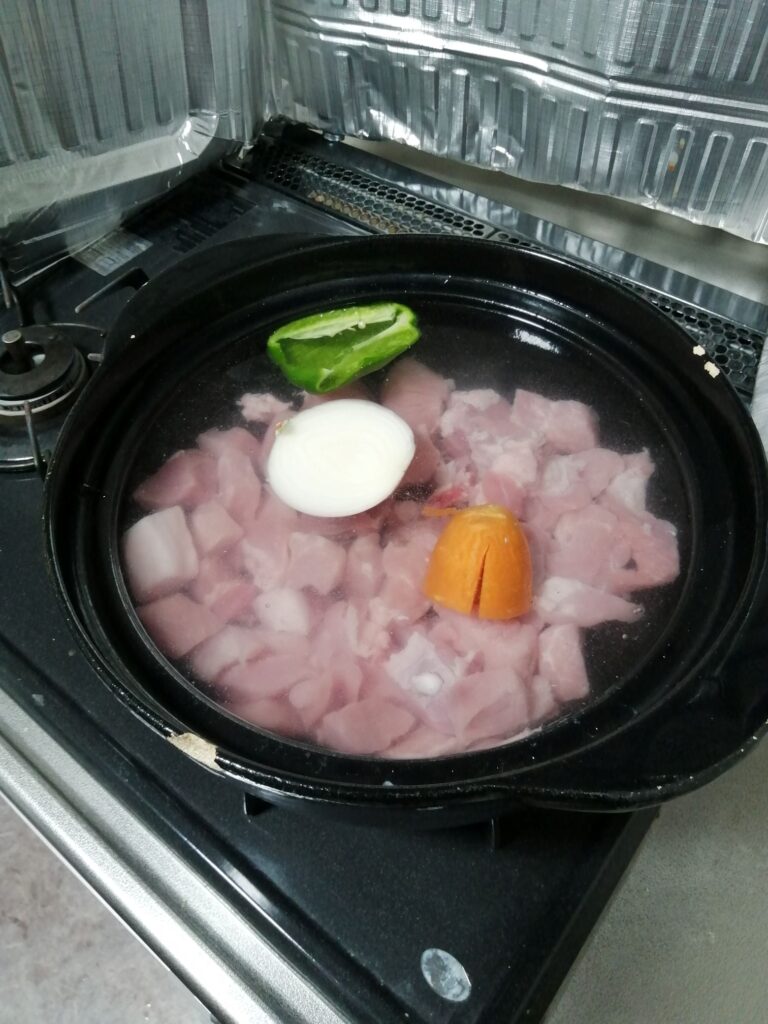 豚肉600gに人参、キャベツ、ビーツ、缶入り豆、玉ねぎ、にんにく、トマト缶、トマトペースト、お酢、ローリエ、粒こしょう、香りづけにピーマン(これはニーナさんの好みです)です。材料を細かく切っていきます。時間の都合上、今日は缶のビーツを使います。ブイヨン作りからスタート。水を張って、豚肉、人参、玉ねぎ、ピーマンを入れます。人参と玉ねぎで出汁を取るのが、本式だそう。確かに、以前来て下さったオデッサのナージャさんも玉ねぎを丸ごと1個放り込んで、出汁をとっていた記憶があります。