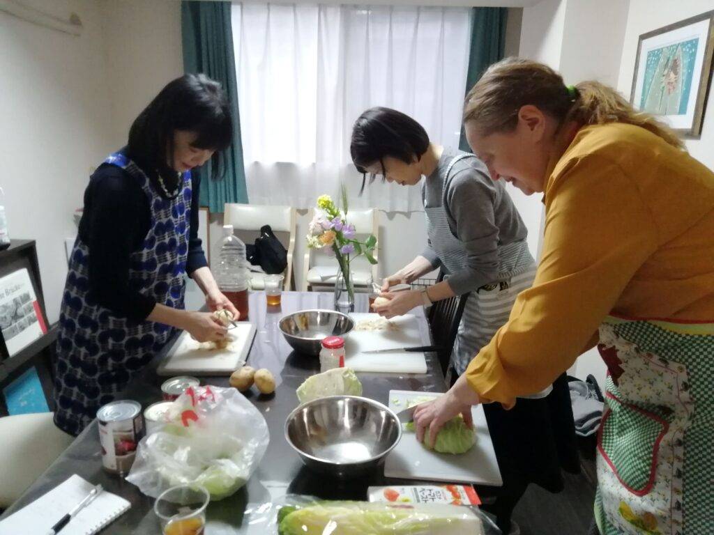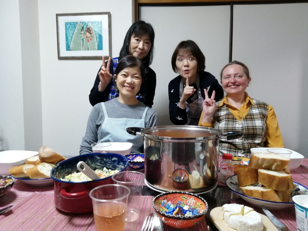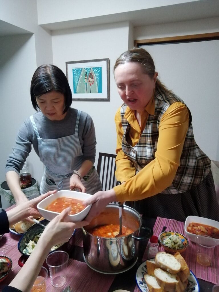 2022年9月に始まったこの料理教室も38回目。定番料理と言えばボルシチですが、私達は5回もそれぞれ工夫されたボルシチを楽しんできました。ボルシチは、日本で言えばお味噌汁またはお雑煮。家庭によって異なるレシピで、その家の「我が家のボルシチ」があります。ちなみに私のボルシチは、新卒で働き始めたラジオ局で、美人でお料理上手の日本人の先輩アナウンサーが教えて下さったレシピが最初。先輩は、ロシア人に教わったと言ってたっけ。時は1998年、ロシアはルーブル切り下げの冬の時代。肉が高くて、肉の缶詰「トゥションカ」使ってたんだよねえ。今じゃあ、私もお肉を買えるようになったのよ!