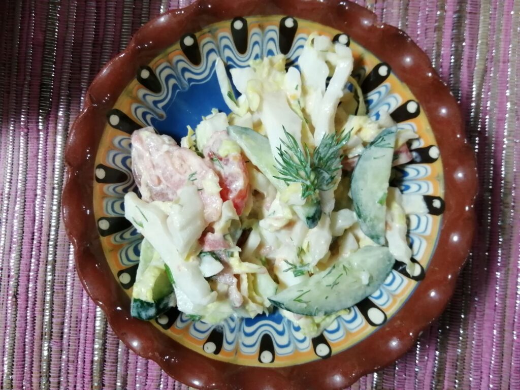 白菜のサラダはとても簡単。トマトときゅうりと白菜とゆで卵を切って、マヨネーズで混ぜ合わせるだけ。「白菜、サラダにしちゃうんですか~!」「ハイ、ウクライナでは白菜はサラダ。スープには入れません。柔らかくてサラダ向きですね。ここに茹でた鶏肉を入れても美味しいですよ。ただし、マヨネーズのサラダはその日のうちに食べる事!」なるほど。そのようにいたします。